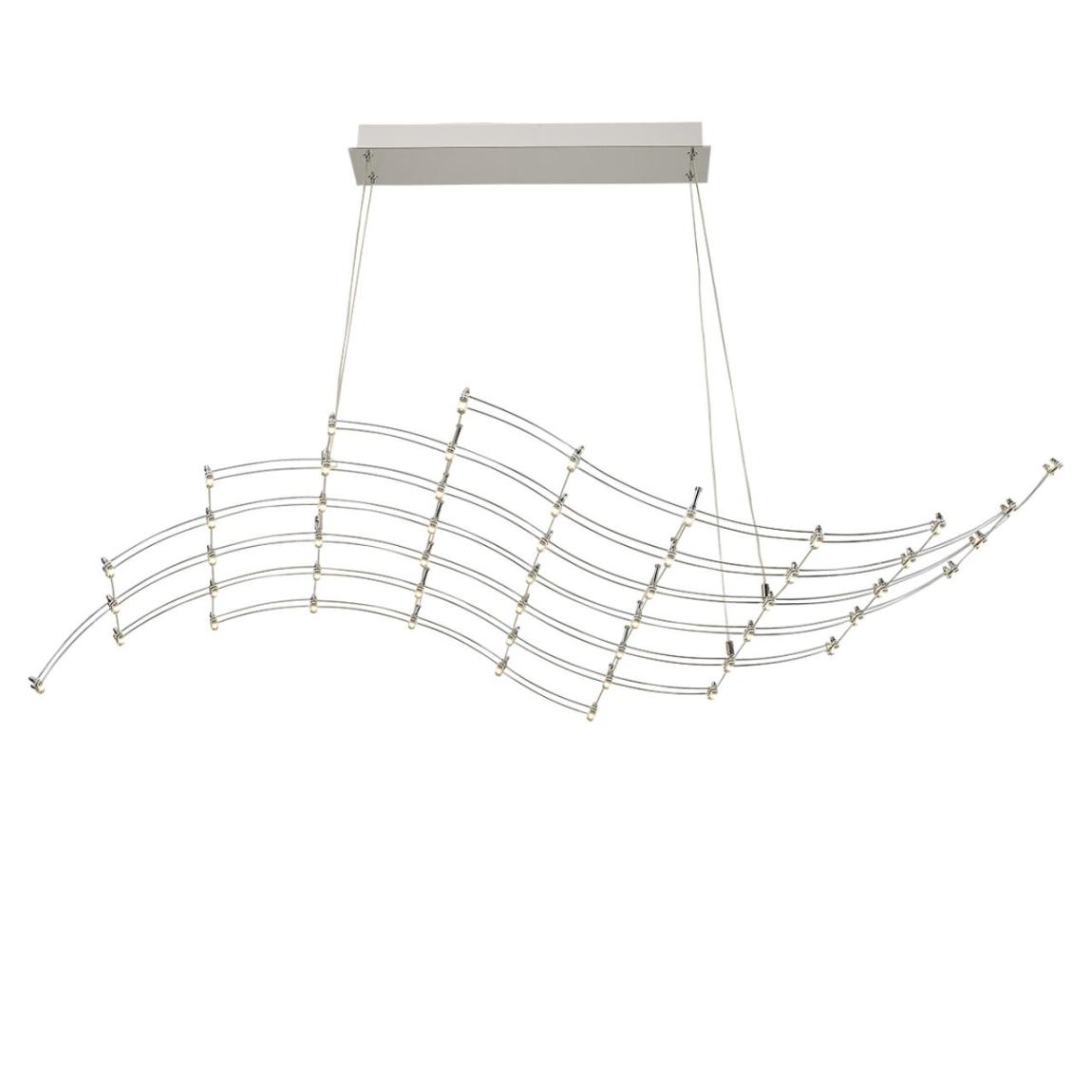 Парящий подвес WELKIN имеет конструкцию из изящных прутьев из нержавеющей стали марки SS304 в цвете хром и золото. Множество равномерно встроенных LED-модулей (100×0,45 Вт) создают мерцающее изогнутое полотно длиной 1300 мм.